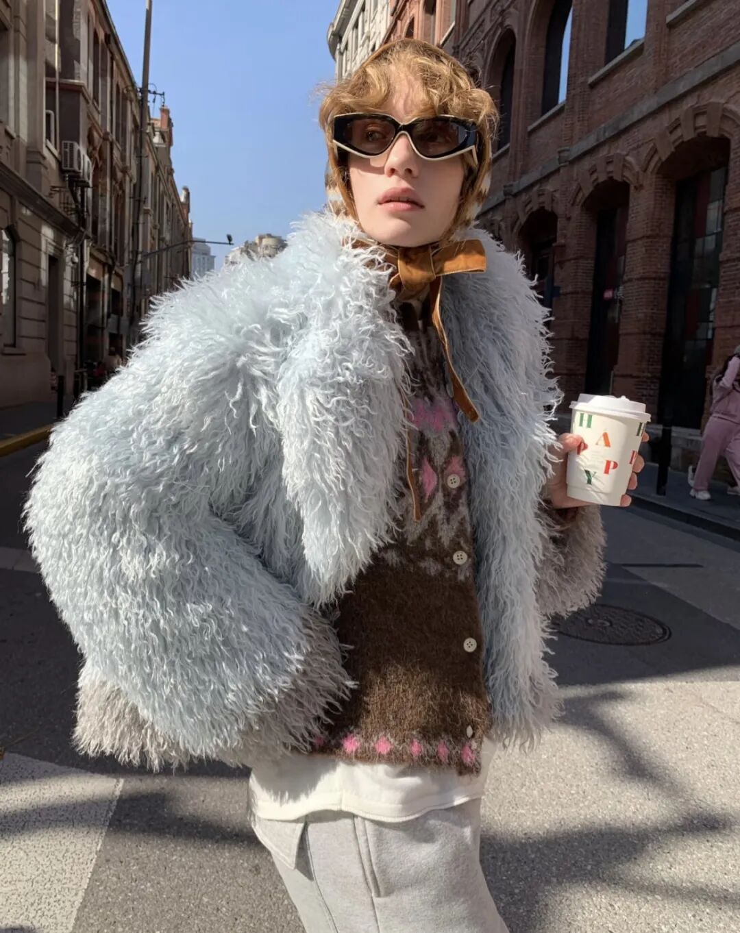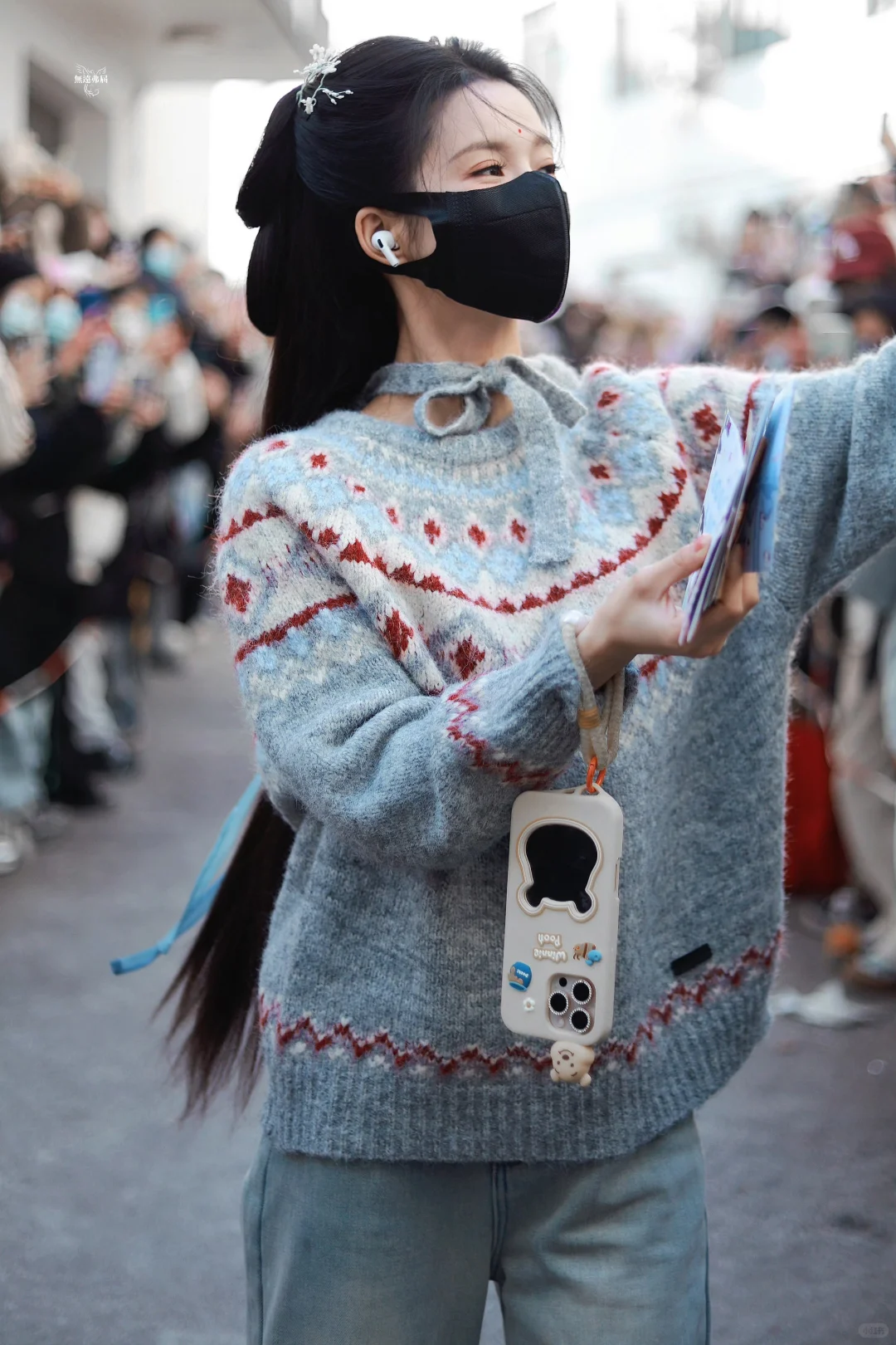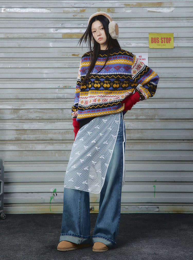 毛衣上的蓝色提花纹样,与复古水洗蓝牛仔裤形成微妙联动,深浅交织不单调,自带复古滤镜。