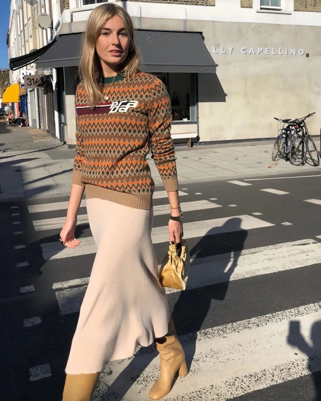 既然毛衣已是视觉重心,配饰便应做减法。