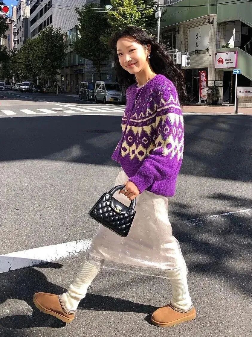 紫色费尔岛毛衣与白色半裙碰撞出清透感,中和了紫色的浓郁,更显灵动减龄。