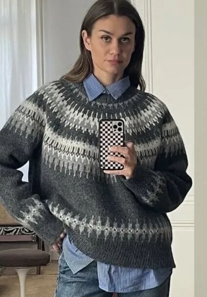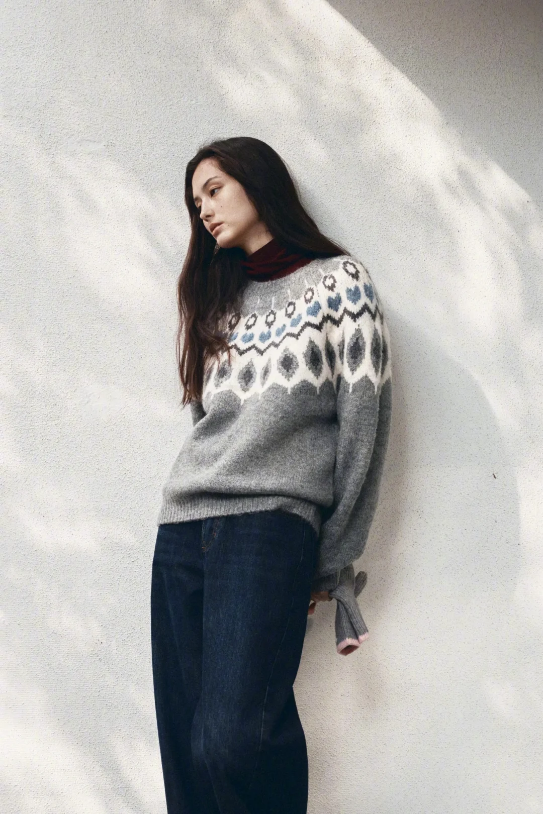 灰色费尔岛毛衣叠穿高领衫,是冬日保暖与质感的双重胜利,下身搭配深蓝色牛仔阔腿裤,沉稳色调与毛衣呼应。