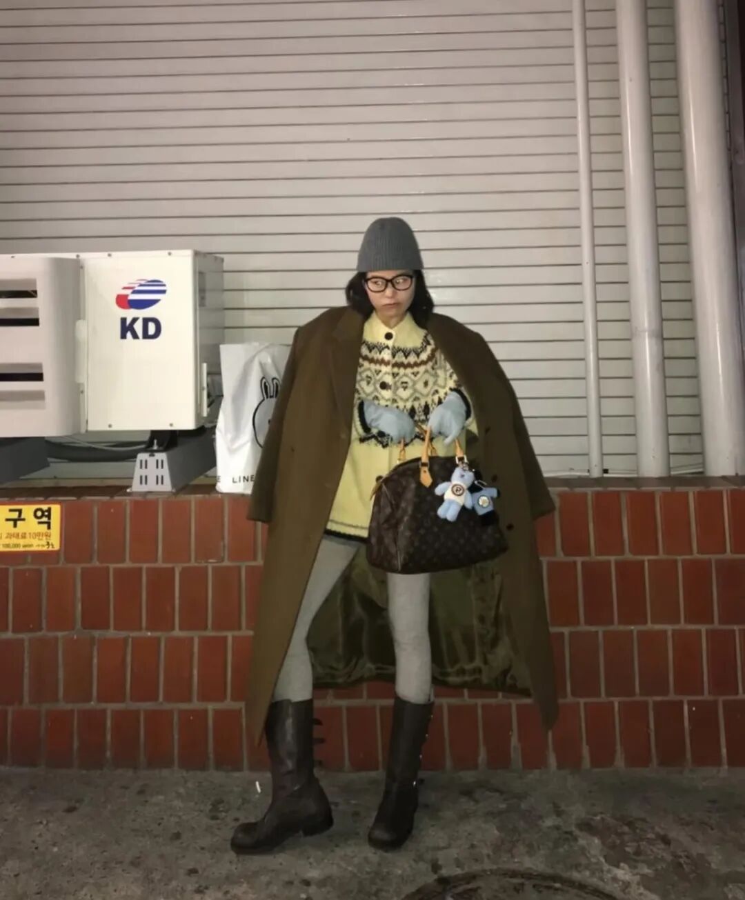 脚踩一双短靴,头戴针织帽,外搭廓形大衣,整体造型既舒适自在又不失时尚感。