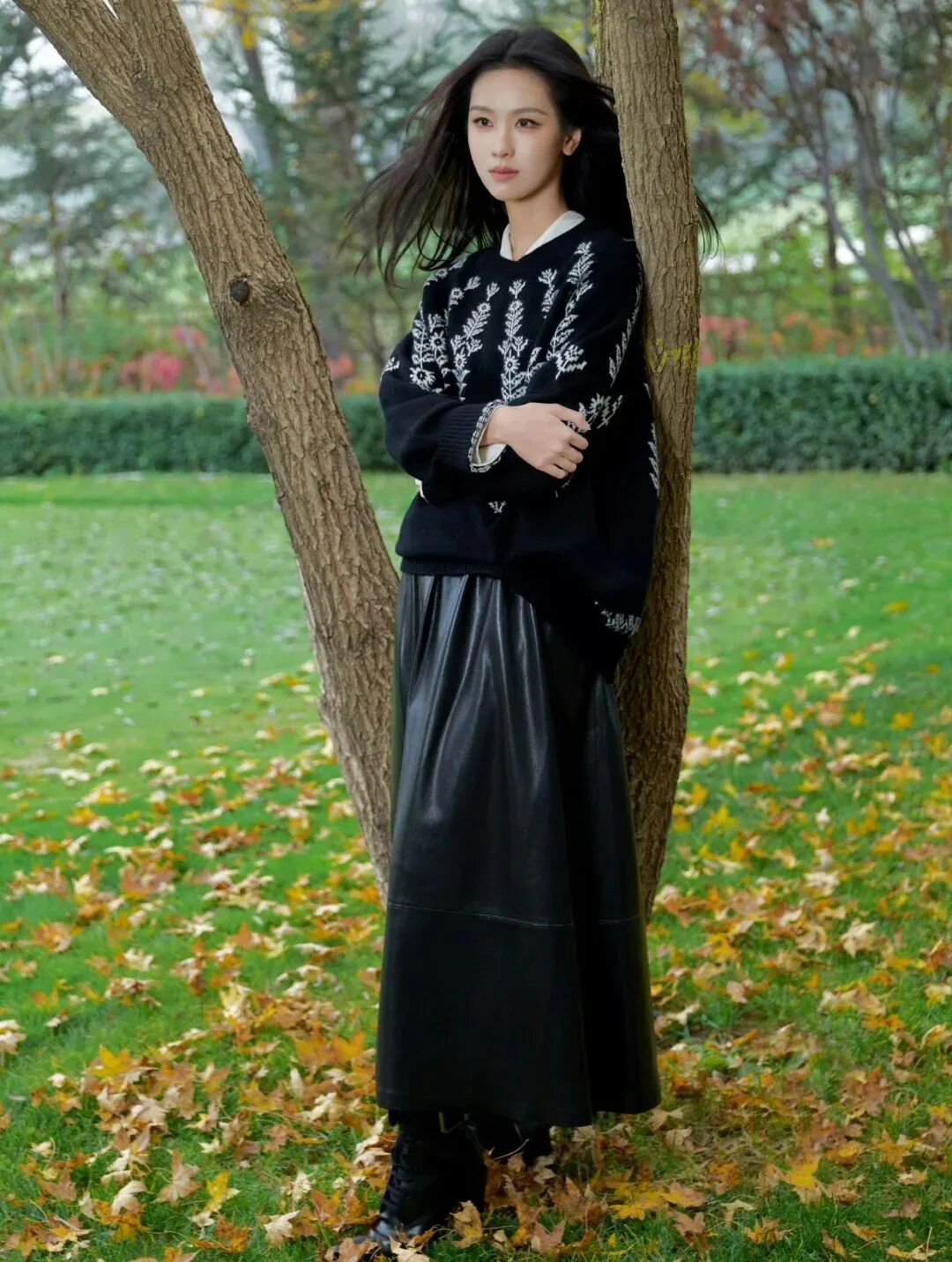黑色费尔岛毛衣搭配黑色半裙,刚柔碰撞更吸睛。