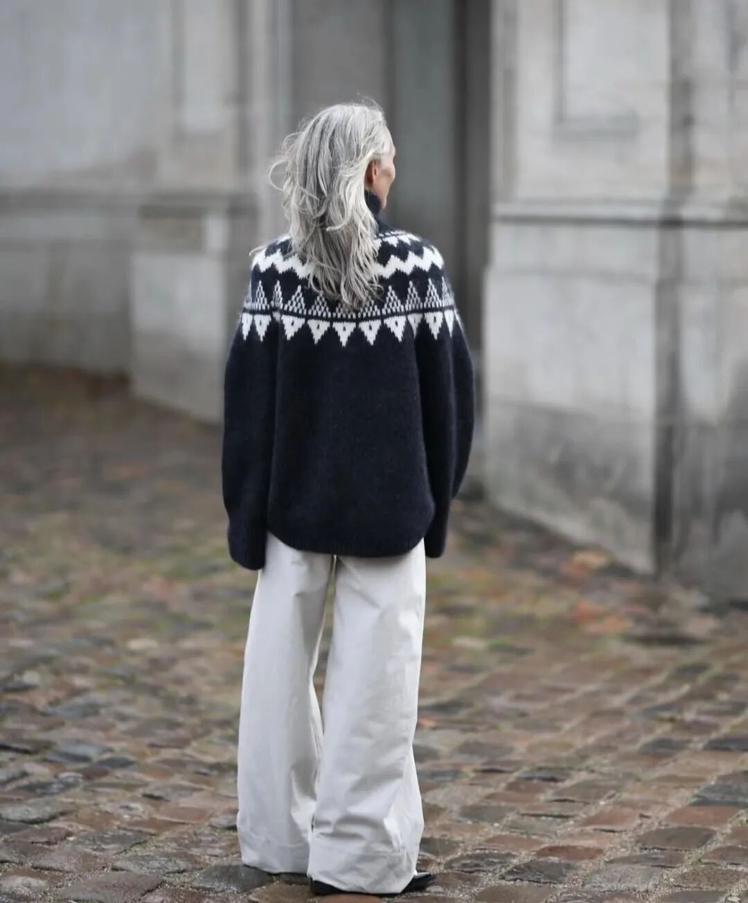 灰色费尔岛毛衣与宽松深灰色阔腿裤形成上糯下松感,显瘦又松弛。