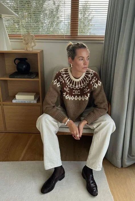 咖色费尔岛毛衣搭配白色直筒裤,整套搭配松紧有度,没有多余装饰却自带高级感。