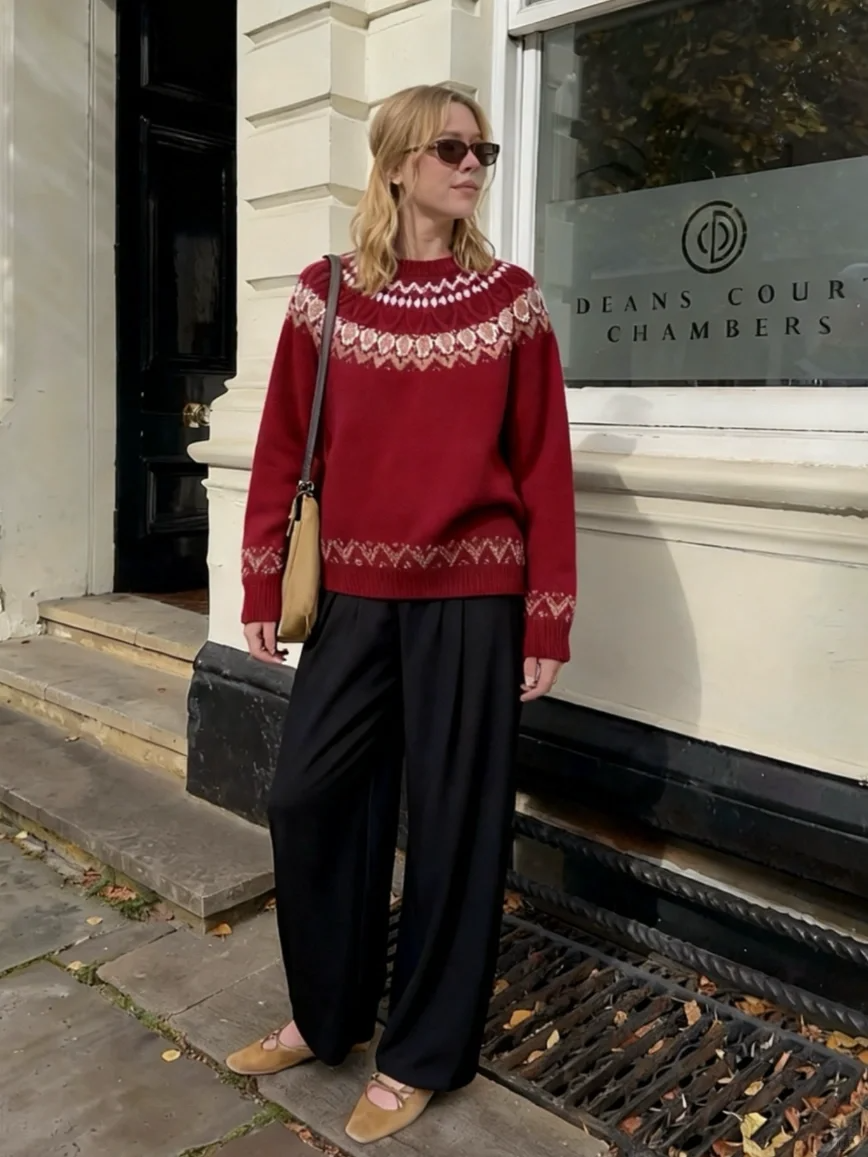 红色费尔岛毛衣自带视觉焦点,复古提花打破纯红单调,与黑色阔腿裤碰撞出经典张力,上艳下沉显瘦又利落。