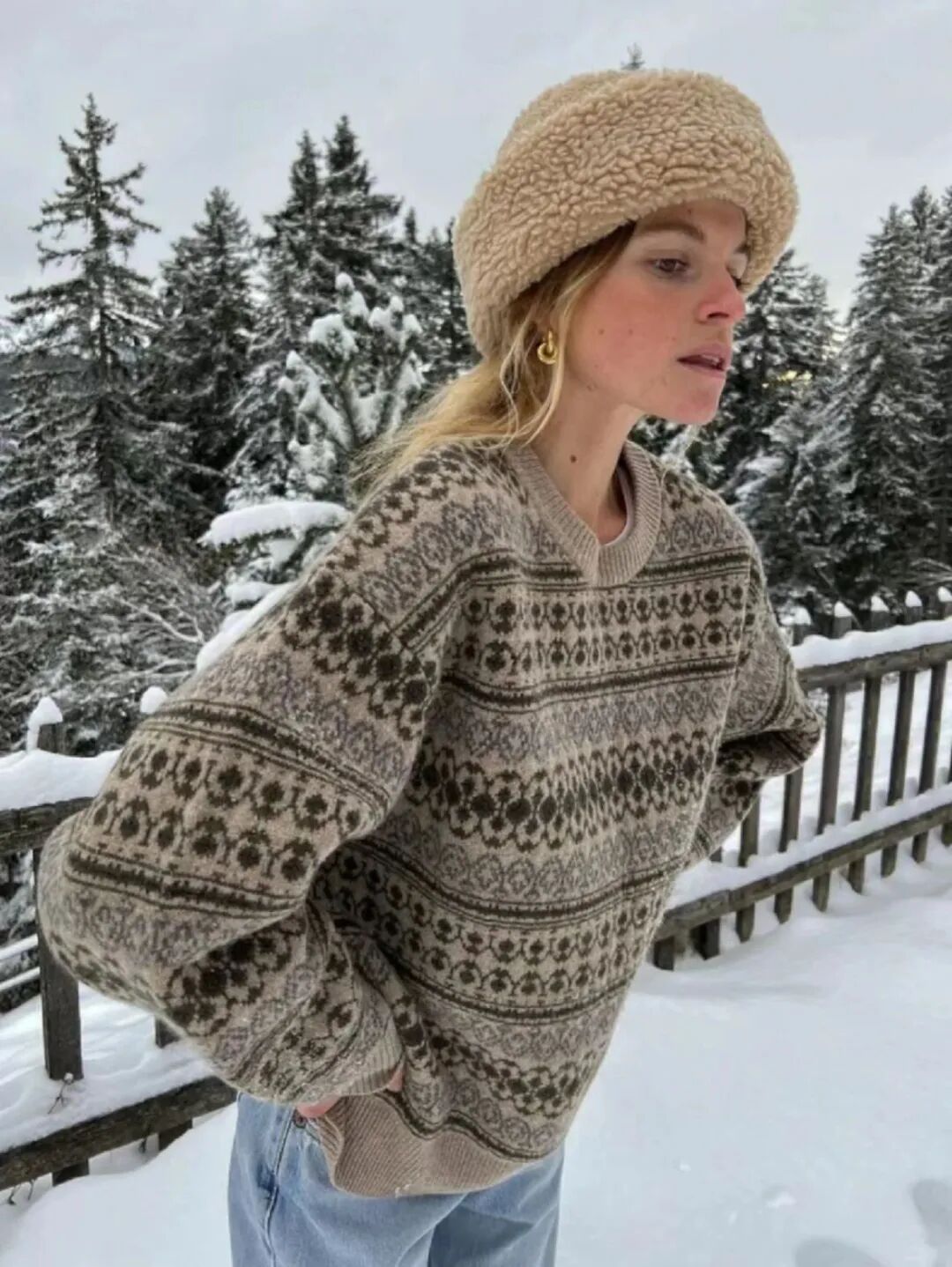 蓝色费尔岛毛衣搭配灰色直筒裤,配一双毛绒雪地靴,戴一顶蓝色针织帽