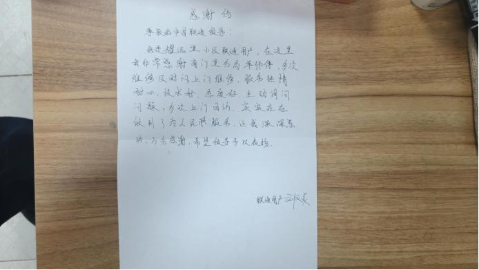 近日,天津联通红桥分公司单奎收到一封来自耀远里小区独居老人的感谢信。信中,老人用质朴的语言称赞他“服务热情耐心,技术好,态度好,实实在在,做到了为人民服务。”