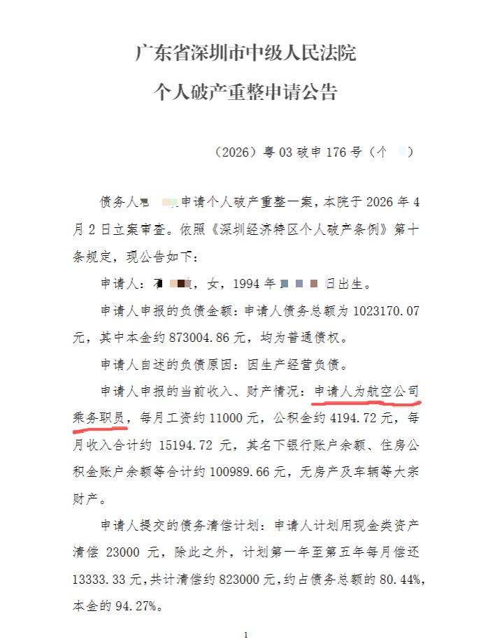 公告显示,石小姐目前负债总额为1023170.07元,其中本金约873004.86元,均为普通债权,粗算下来,其逾期时间约1-2年。石小姐月工资收入约11000元,另外公积金收入有4000元左右,合计1.5万,名下无房无车。