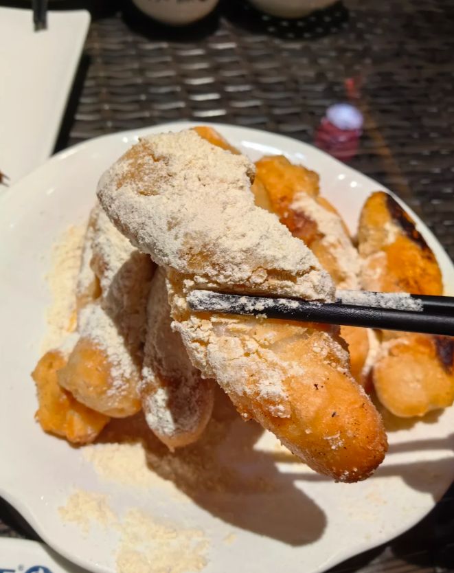 刚出锅的糖饺子,趁热滚上由黄豆粉和白糖混合的粉末。那黄豆粉是现磨的,香气浓郁,混合着白糖的甜,裹在热乎乎的糯米条上,瞬间就融化了。咬一口,外皮是酥脆的,带着黄豆粉的焦香,里面是软糯拉丝的糯米,甜而不腻,软而不粘。那种口感,就像是在吃云朵,又像是在吃甜蜜的梦。