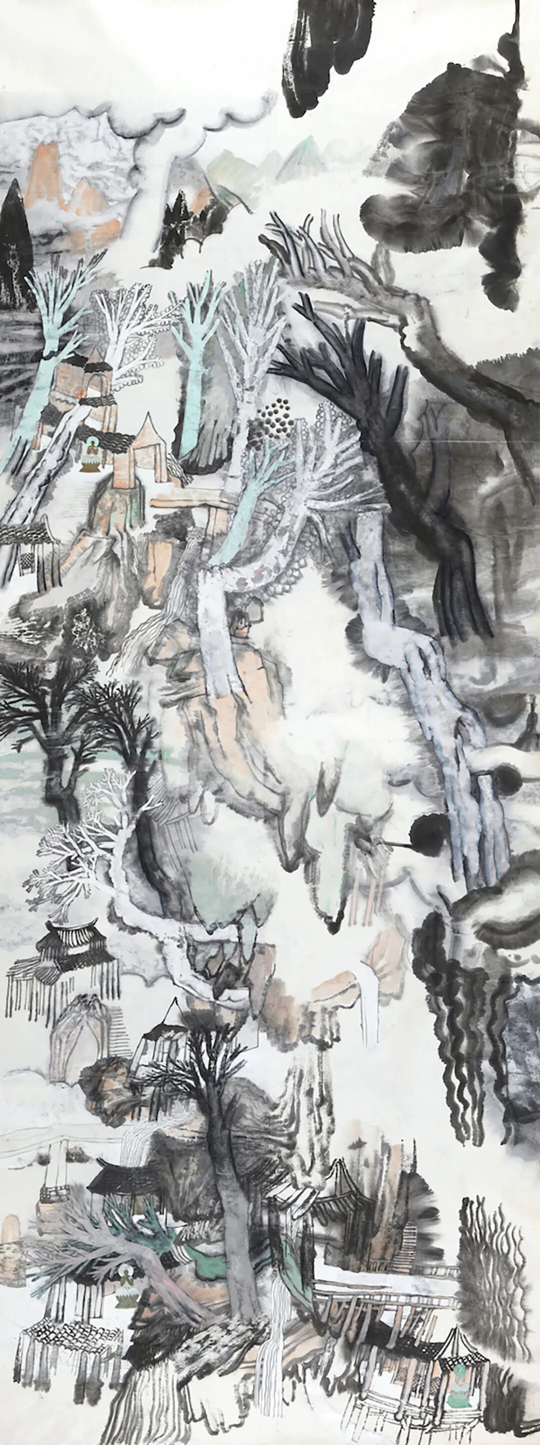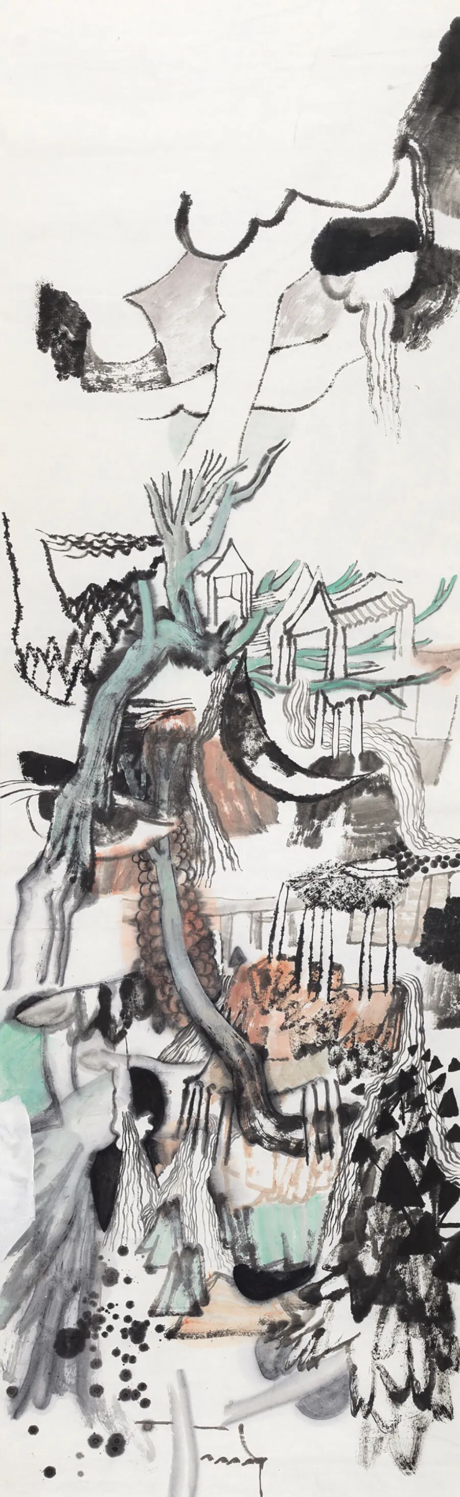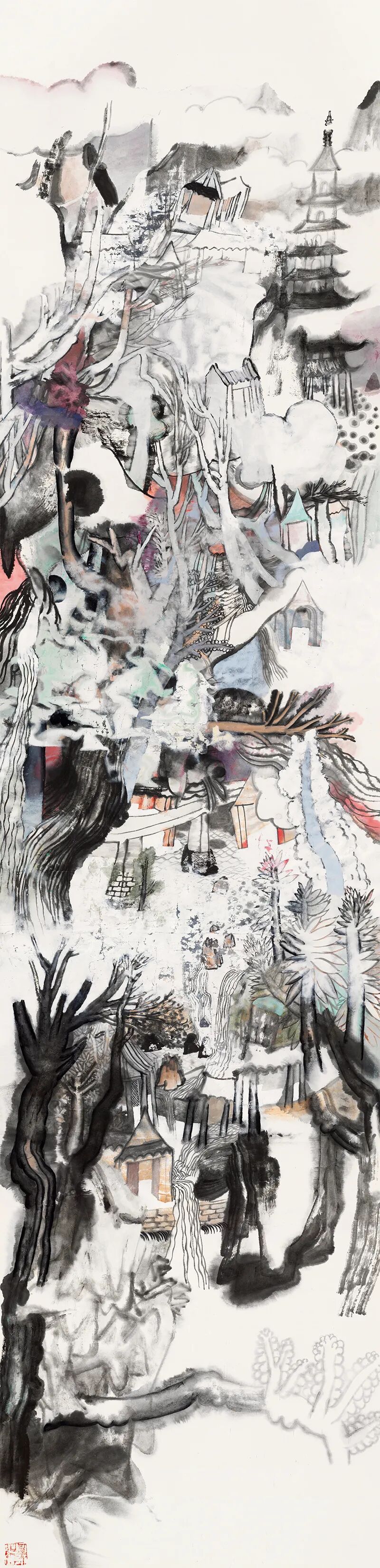 从九十年代就有一个发心,明心见性地认为此发心上和于传统,下归于善良,外追模石涛八大,内求索于心源智慧,祈祷的是菩萨的三身加持。供养在艺术殿堂的是自己过去、现在、未来三世地身、口、意。所追求水墨的音韵是吉祥颂,对比和谐是诸佛心咒的诵鸣交替。三景三远无论是平叙、倒叙或者插叙,都可以经过交错空间地经营,组合画面地搬移。通过造型变异特写式地穿插、掩映、位置的交错、起伏,打破时空,打破常人视觉,最大限度地回归艺术本质。