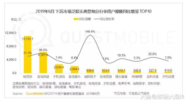 下沉市场成为2019年最重要的战场,泛娱乐行业在下沉市场中优先获得红利,其中以短视频最为突出,同比增量过亿。