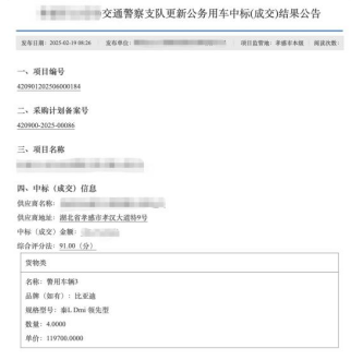 在全国多地政府的实际采购中,比亚迪已成为警车队伍中的“高频面孔”。公开的政府采购公告显示,安徽合肥、辽宁锦州、陕西西安、湖北孝感,再到贵州黔南,多地公安系统的警车采购项目中都出现了比亚迪旗下车型的身影。这些车型覆盖了秦PLUS、宋Pro、宋PLUS等多款主力产品,应用于日常巡逻、刑事侦查等多种执法执勤场景。