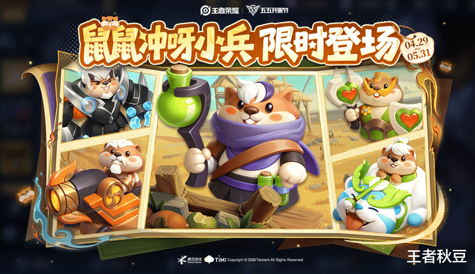 暴击夺宝限时回归,活动时间4月29日-5月5日,暴击保底积分打折(积分夺宝也同期打折),5抽只需要200点券。暴击夺宝虽然随机获得荣耀典藏奖励,但是有更高的累计值。本次还上线了一款新的小兵皮肤-鼠鼠冲呀,看起来也是非常可爱。