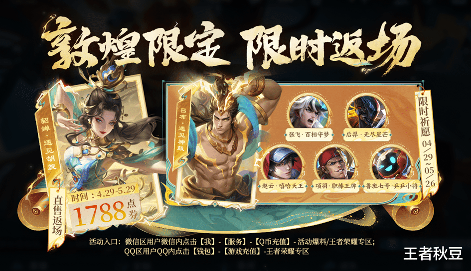 吕布遇见神鼓、张飞百相守梦、后羿无尽星芒、项羽职棒王牌、赵云嘻哈天王、鲁班七号乒乒小将皮肤限时回归。活动时间:4月29日 - 5月26日,通过活动页面购买买红蓝对决播报用返场祈愿币抽奖获取。