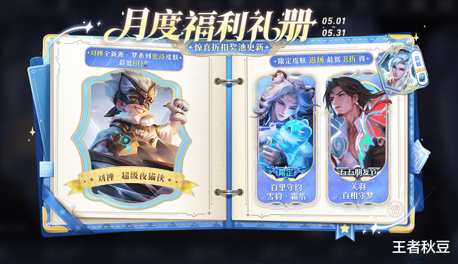 五月礼册上新,刘禅源梦皮肤将上线福利礼册,通过刷新奖励,最低只需要60点券就能入手这款源梦皮肤。另外返场的两款限定皮肤是守约-雪豹·霜爪和关羽的百相守梦。注:礼册奖励每个月只能领一次,大家记得在5月1日前将4月的领取了。