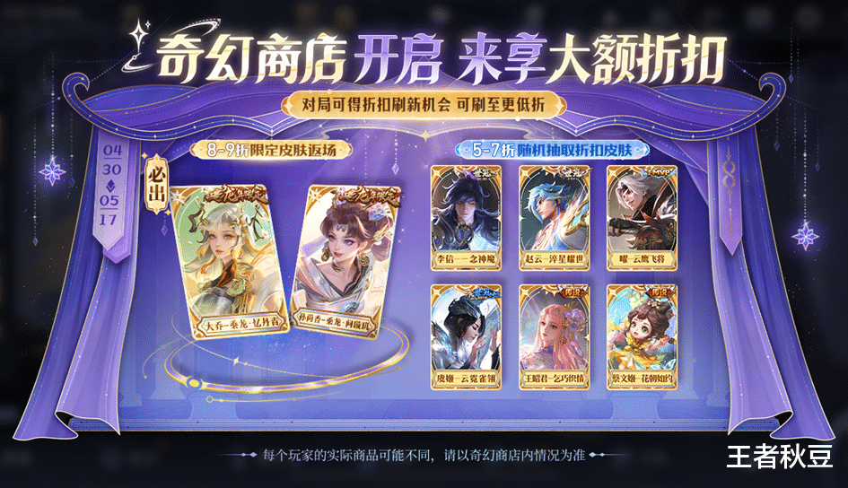 活动时间:4月30日-5月17日,活动期间玩家将随机抽取25个折扣商店,100百抽到未拥有的限定皮肤,本期返场的限定皮肤是大乔和孙尚香的龙年限定皮肤,活动期间完成对局任务可以获得2次折扣刷新机会,限定皮肤折扣随机为8-9折。直售皮肤则随机为5-7折。可以用皮肤碎片抵扣点券,1皮肤碎片可抵扣10点券,最多抵扣5个碎片。