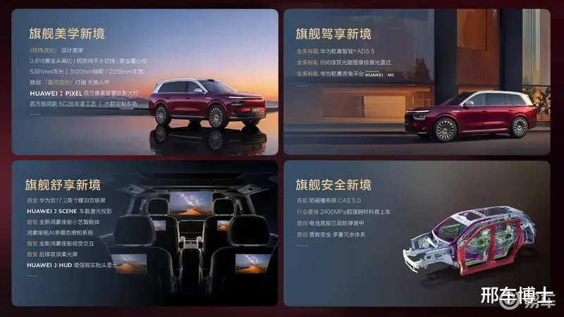一是树立旗舰安全新标准。奕境X9全系标配华为乾崑最新一代CAS5.0,车身首次量产应用2400MPa超高强度钢,搭配行业首创三层防弹级电池装甲,以全维度无死角安全防线,将用户出行安全标准提升至全新高度。二是刷新旗舰舒享新标准。奕境X9首发全新一代鸿蒙座舱6,升级智慧交互体验,让智能座舱成为主动服务用户的智能体,兼顾便捷性与舒适性。三是建立旗舰驾享新标准。奕境X9全系标配华为乾崑智驾ADS 5及896线激光雷达,以全主动预判驾驶能力,重新定义高端车型的驾驶乐趣与操控体验。