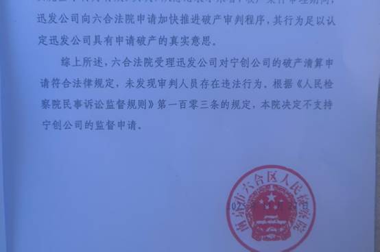 2025年12月3日,南京市六合区人民检察院向江苏宁创农业科技开发有限公司法定代表人张萍送达《不支持监督申请决定书》,维持了此前法院的破产相关程序。张萍表示,这家曾获国家地理标志产品认证的农业企业,在未经通知、听证及资产评估的情况下被裁定进入破产程序,而检察院的监督决定未能支持其关于程序违法的诉求。该案引发对基层司法程序中送达、举证责任、破产条件认定及检察监督实效的多重讨论。