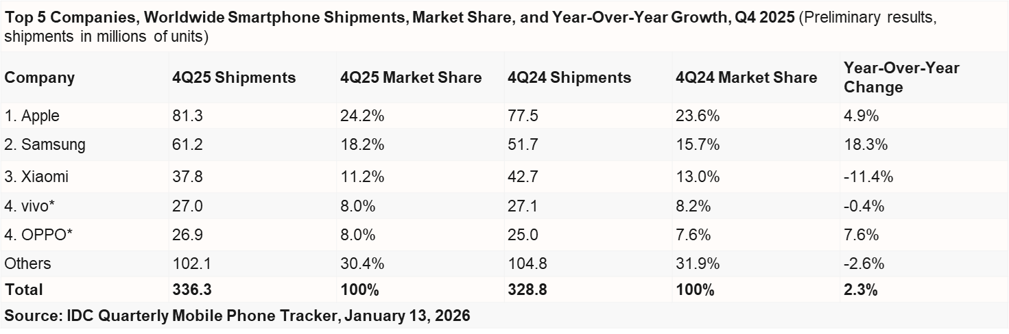 1月14日 ,国际数据公司IDC 发布2025年全球智能手机市场跟踪报告, 2025年全球智能手机总出货量累积12.6亿部,同比增长1.9%,智能手机市场延续复苏态势。第四季度受高端手机的持续增长以及消费者预期价格上涨的积极影响,出货量达3.363亿部,同比增长2.3%。