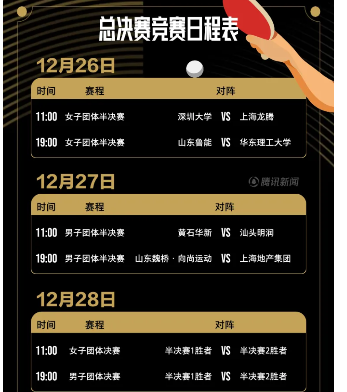 本次总决赛赛程紧凑且看点密集。12月26日女团率先开战,11:00孙颖莎领衔的深圳大学迎战上海龙腾,19:00王曼昱、陈幸同坐镇的山东鲁能对决王艺迪所在的华东理工大学;27日男团半决赛接力,林诗栋领衔的黄石华新挑战林高远率领的汕头明润,19:00更是迎来焦点战——15胜1负的常规赛霸主山东魏桥(王楚钦、梁靖崑压阵)对阵樊振东、许昕所在的上海地产集团;28日11:00女团决赛、19:00男团决赛将相继收官,悬念即将揭晓。