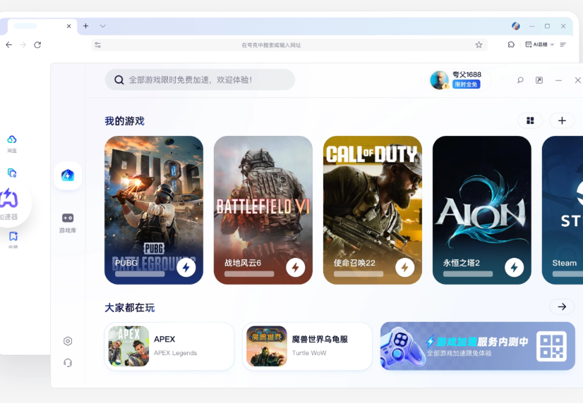 很多人以为只能换热点或等回家再玩,但其实有个更省事的办法——夸克PC端(夸克浏览器Windows版)内置的 “加速器” 功能,能智能穿透受限网络环境,无需额外安装软件,完全免费,点一下就能用!