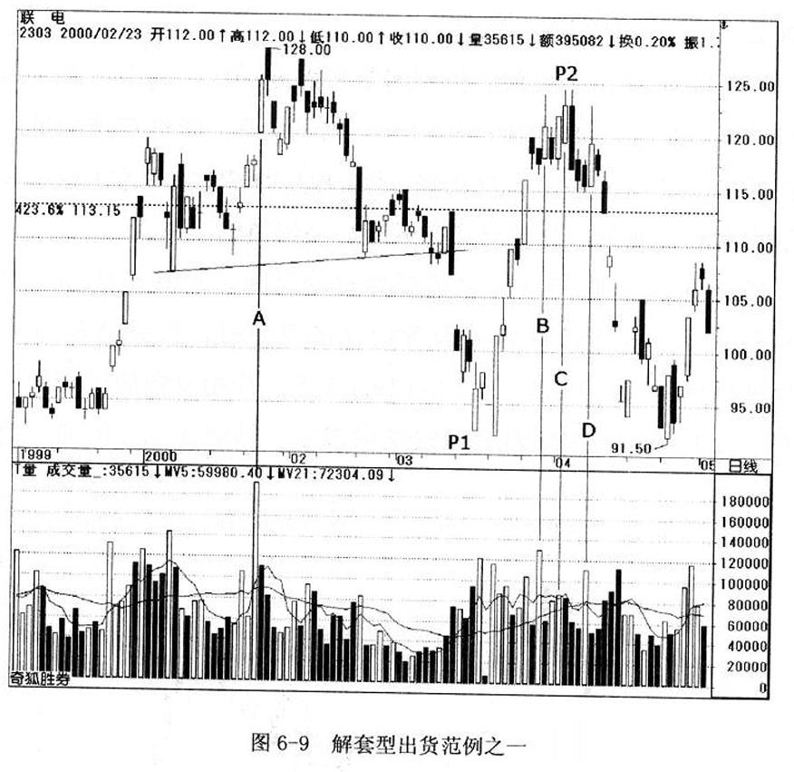 解套型出货的意义,是前波高点可能利用盘头出货,或是反转型出货等不同出货模式之后,股价修正到支撑位置开始出现反弹1/2以上的走势,在图6-8中标示P1~P2的这一段反弹走势就称为“解套型出货”。