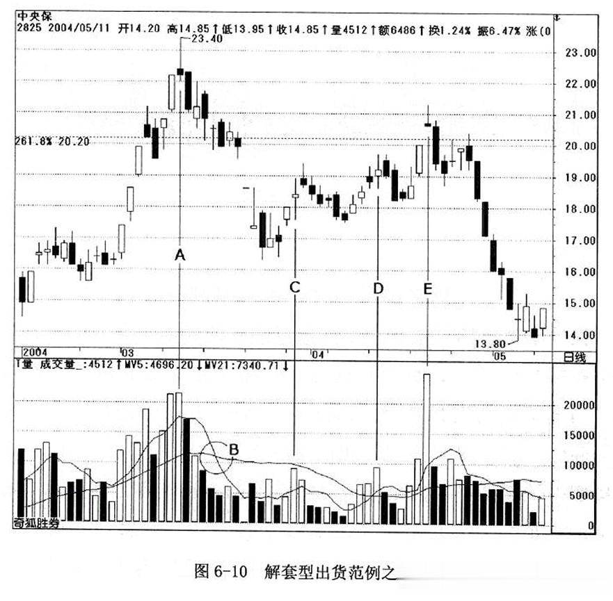 当股价下跌到16.3元之后开始出现反弹,反弹时请与当时加权指数、个股的股性等相关因素相互搭配分析,假设会反弹1/2,则反弹目标=(23.4+16.3)÷2=19.85元。开始反弹的过程中,标示C、D、E都出现中指量止涨的技术现象,其中标示E的前一笔中长红棒线,穿越反弹1/2的目标价,标示E当笔随即暴出前一日两倍以上的大量,并且呈现股价止涨,K线为避雷针的形态,暗示主力最后一次出货,此时理应已经出清所有多单,甚至伺机做空。