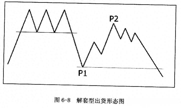 解套型出货约有7成左右的走势会使投资人误以为股价仍在多头波动,因为走势会相当强劲,且呈现短期趋势的量价齐扬。在操作上,因为出现本出货模式之前,股价会先满足黄金螺旋倍幅才产生反转,反转向下修正的过程中必定会对原多头上涨的走势产升趋势的破坏,因此在P1点附近开始进行反弹,介入的多单应该定位在抢短操作。