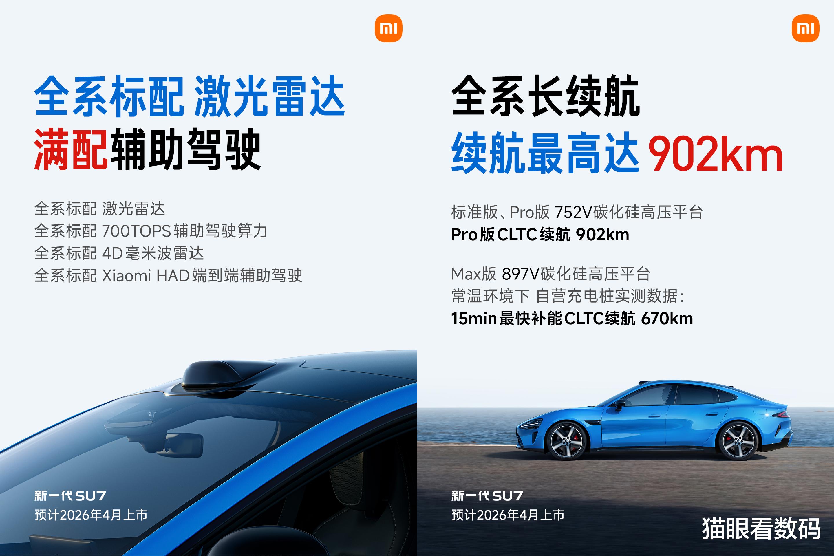 总的来说,新一代小米SU7的升级逻辑很清晰。最核心的改变在于,它将激光雷达和高阶智驾系统在硬件层面做到了全系标配,直接将高阶智驾的硬件门槛拉到了最低。与此同时,续航、底盘、安全等基础维度的补强,也让它成为了一款短板更少、综合实力更均衡的产品。对于2026年的新能源市场来说,这样一台在智能化上“入门即高配”,同时基础素质也全面提升的车型,其竞争力不容小觑。