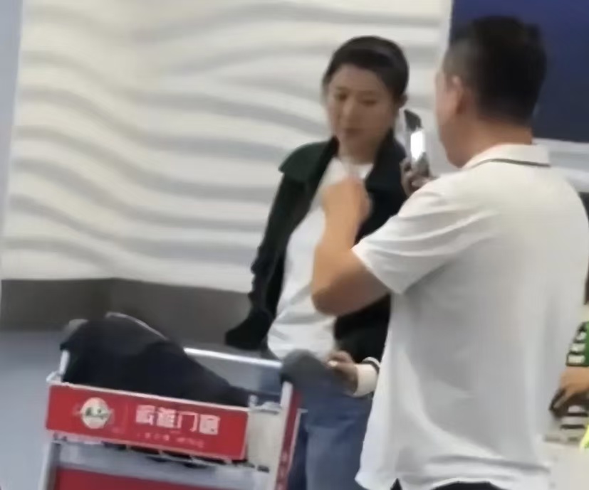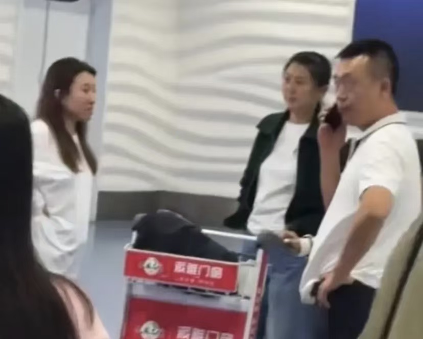 旁边还有一位女士,几人的脸色都不太好。闫学晶出行就简单拿了一个小背包,看样子不是打算长久离开三亚。机场的行李车上还打着广告,闫学晶的老公一个电话接一个电话的打,磨蹭了好久都没有离开。