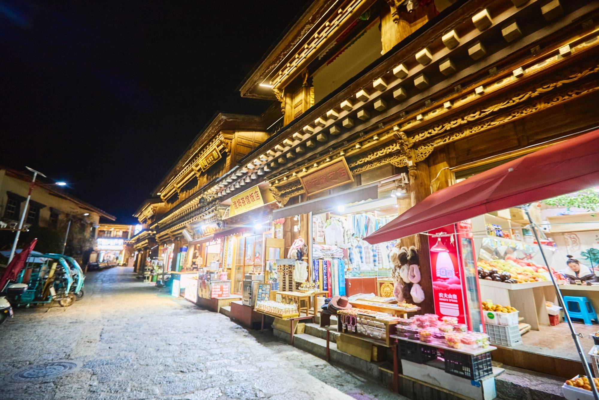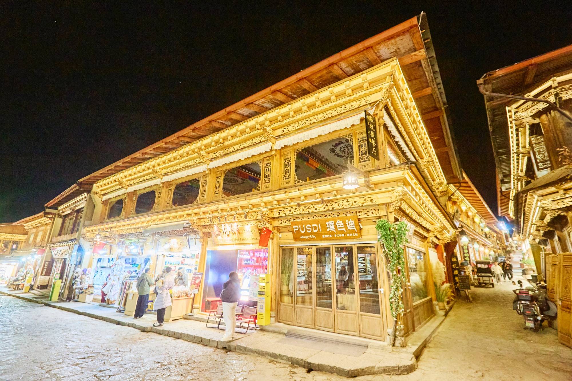 木雕在灯光照耀下更显华丽,精致得仿佛一件艺术品。一层小店里是琳琅满目的饰品、文创用品,二楼还可以俯瞰整个古城全貌,感受独克宗夜晚的璀璨夺目。
