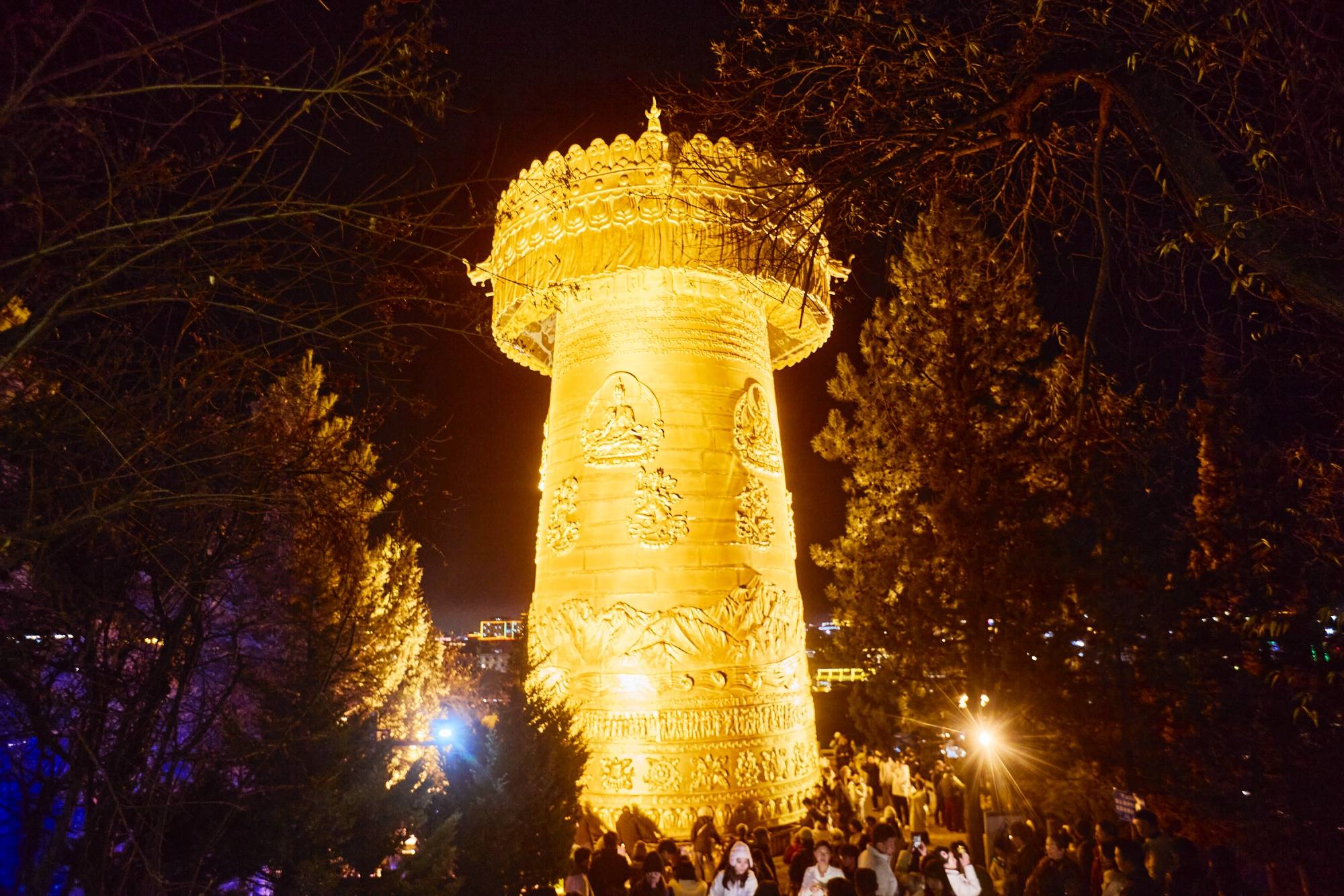 还未入城远远就能看见伫立在龟山公园中的巨型转经筒,它是独克宗古城的地标建筑,也是世界上最大的转经筒之一。明亮的灯光将转经筒照得熠熠生辉,巨大的身躯需要多人合力才能转动起来。