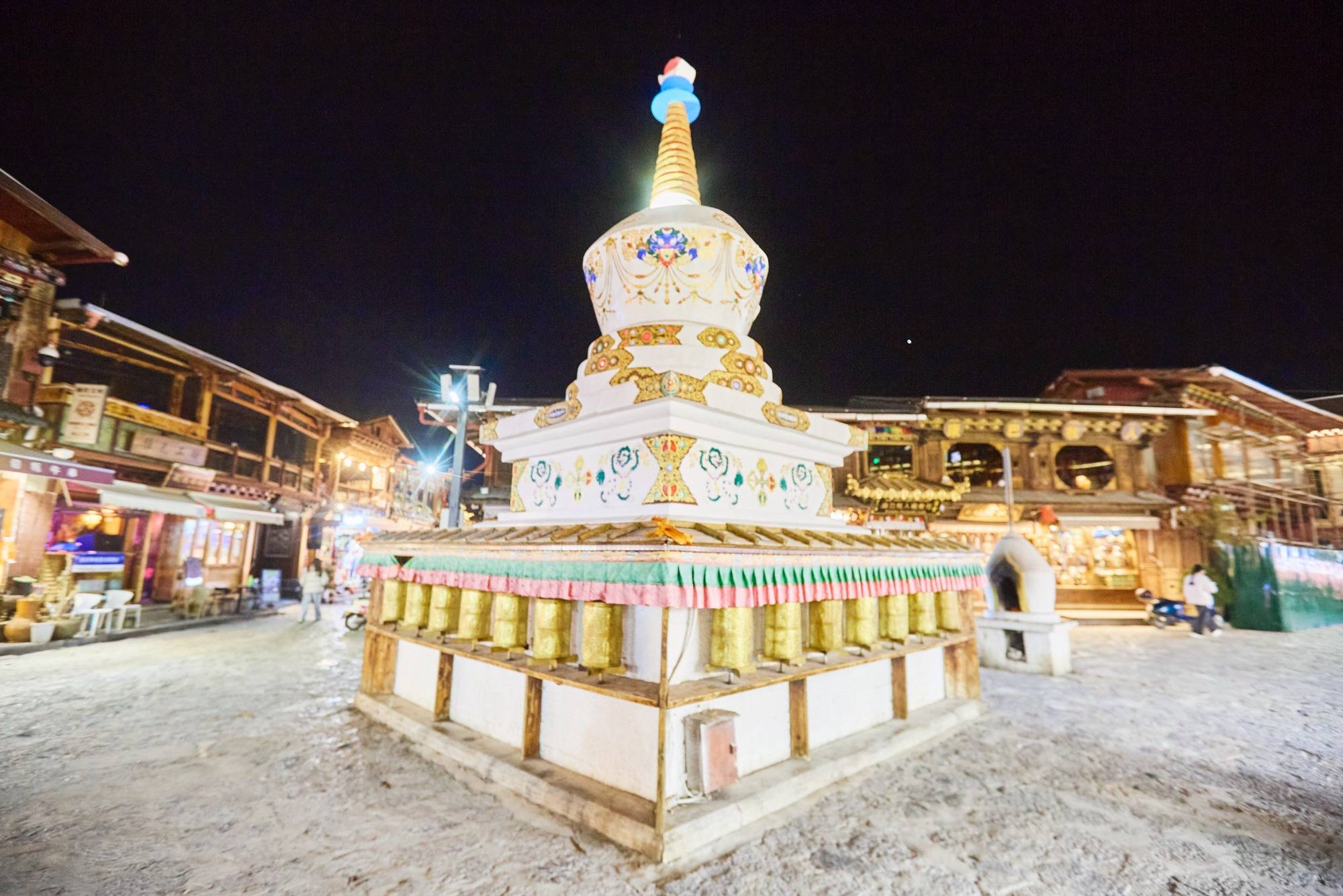 白塔位于古城中心,素雅塔身上描绘着彩色花纹,塔基环绕着转经筒,四周是灯火通明的商铺,古城的宗教氛围和烟火气就这样完美融合在一起。