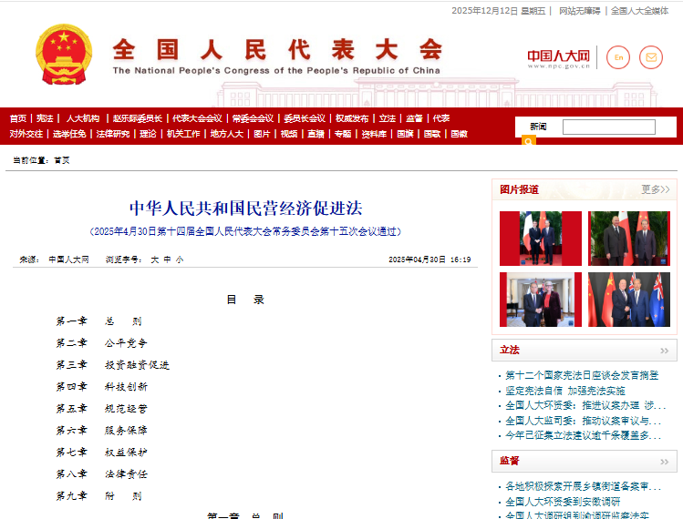 2025年4月30日第十四届全国人民代表大会常务委员会第十五次会议通过《中华人民共和国民营经济促进法》(下文简称《民营经济促进法》)。