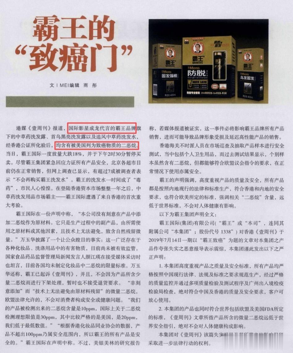 风波牵连早在2010年,成龙代言的霸王洗发水就被曝含有致癌物二恶烷。