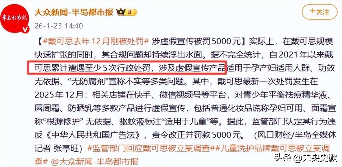 很少有人知道,郭晶晶是2025年初正式成为该品牌代言人的,而从她代言开始到翻车,短短一年时间,戴可思已经被处罚了五次。