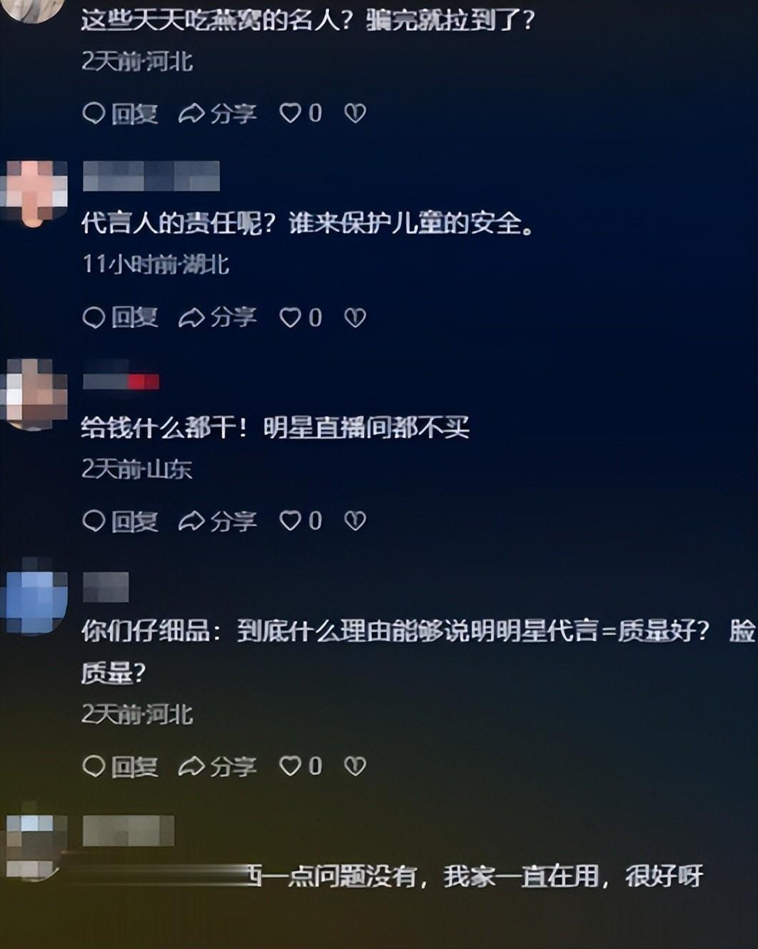 郭晶晶的争议还在发酵,网友们的讨论渐渐延伸到了“明星代言审核”这个话题上,有人发起提问,还有多少明星和郭晶晶一样,只顾着赚代言费,不顾产品安全?