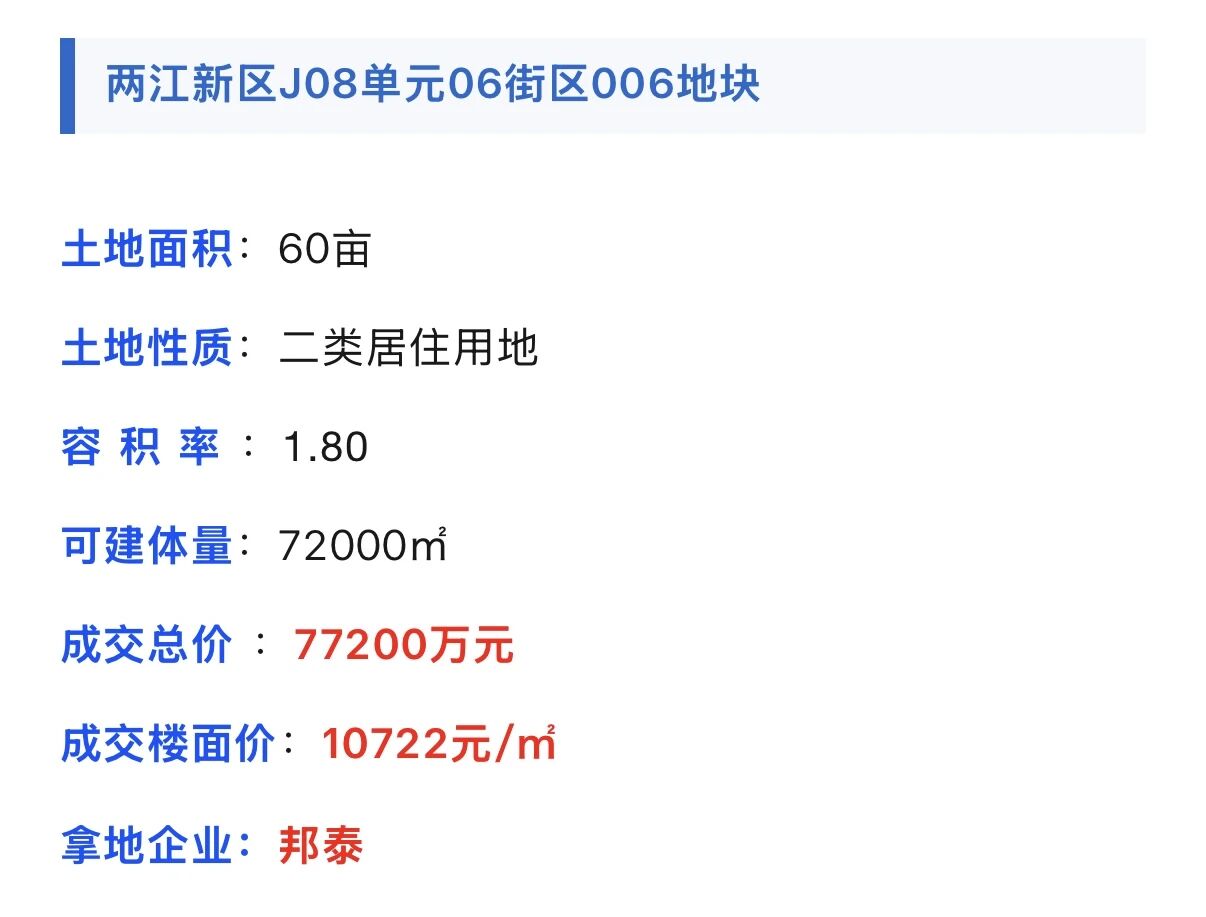 2025年12月5日,照母山一宗土地面积60亩、总体量7.2万方的住宅用地,被四川房企邦泰以10722元/㎡的楼面地价成功拿下,溢价12.8%。照母山地价再次破万!【土地信息】地块编号:两江新区J08单元06街区006地块总用地:60亩用地性质:二类居住用地商住比:纯居住可建规模:7.20万㎡容积率:1.8成交总价:77200万元成交楼面价:10722元/㎡竞得人:邦泰成交时间:2025年12月5日这宗土地位于两江新区照母山板块,区域配套比较成熟。周边有万科星光森林、康田蔚蓝海、东原湖山樾、融创凡尔赛、龙湖尘林间、舜山府等多个当年的知名网红楼盘。