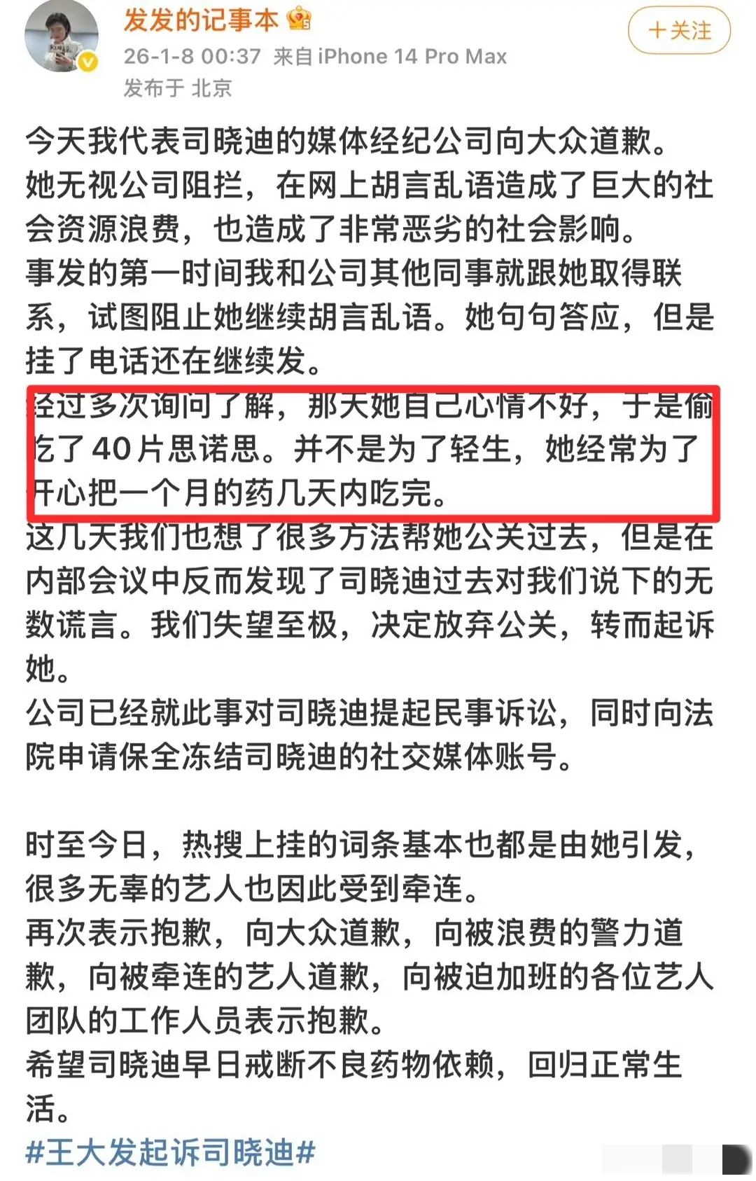 疑点重重第一,王大发说司晓迪精神有问题,药物滥用。但是她却提供不了诊断书、处方单和就诊记录。只是她口头说司晓迪一次吃了40片的思诺思,然而这种说法却缺乏医学根据。
