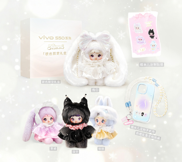 vivo S50系列和糯米儿梦幻联动,不仅有同色系糯米儿限定毛绒玩偶,每一款都可爱到爆,还有手机挂绳、手机壳、限定壁纸和萌趣贴纸等周边,很治愈~
