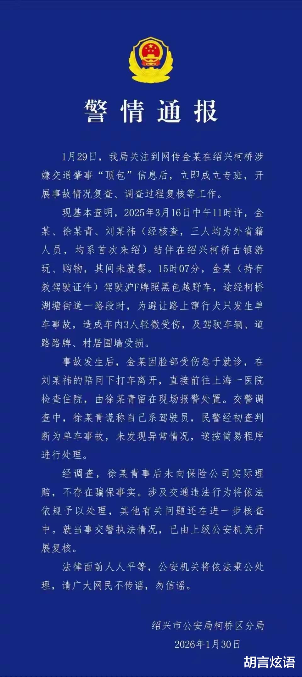 1月30日,绍兴柯桥警方的一则警情通报,让演员金某的交通肇事顶包事件浮出水面。通报清晰还原了真相:金某驾车避让窜行犬只引