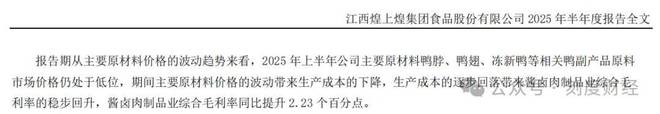 光大证券研报显示,绝味、周黑鸭、煌上煌等卤味企业的成本构成中,原材料普遍占比70%-80%,极易受到上游原材料价格的影响。煌上煌利润增长的核心推手,正是原材料价格带来的“意外红利”。