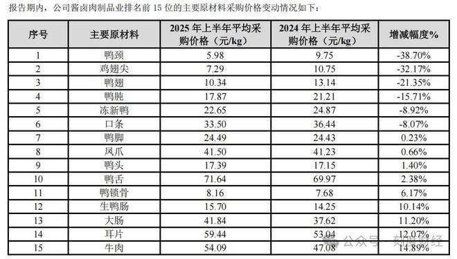 作为酱卤业务的核心成本项,鸭颈、鸡翅尖等主要原材料价格在2025年上半年迎来大幅回落,其中鸭颈价格同比下降38.70%,鸡翅尖下降32.17%,鸭翅下降21.35%,冻新鸭等其他鸭副产品价格也处于低位区间。