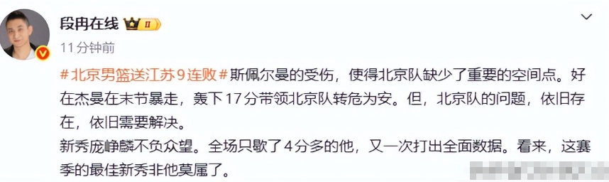 苏群老师的发言很有道理!侃大山也认为北京男篮确实遇到了困难。面对江苏这支弱旅,北京队本场比赛打得非常狼狈,尤其是第二节,单节仅得到15分。本场比赛许利民指导让杰曼打替补,导致首发阵容缺少创造机会的球员;没有杰曼的串联创造,两名功能性球员雷蒙和斯佩尔曼全场比赛加起来仅得到2分。虽然杰曼全场比赛砍下28分,但首发阵容的得分明显下滑。