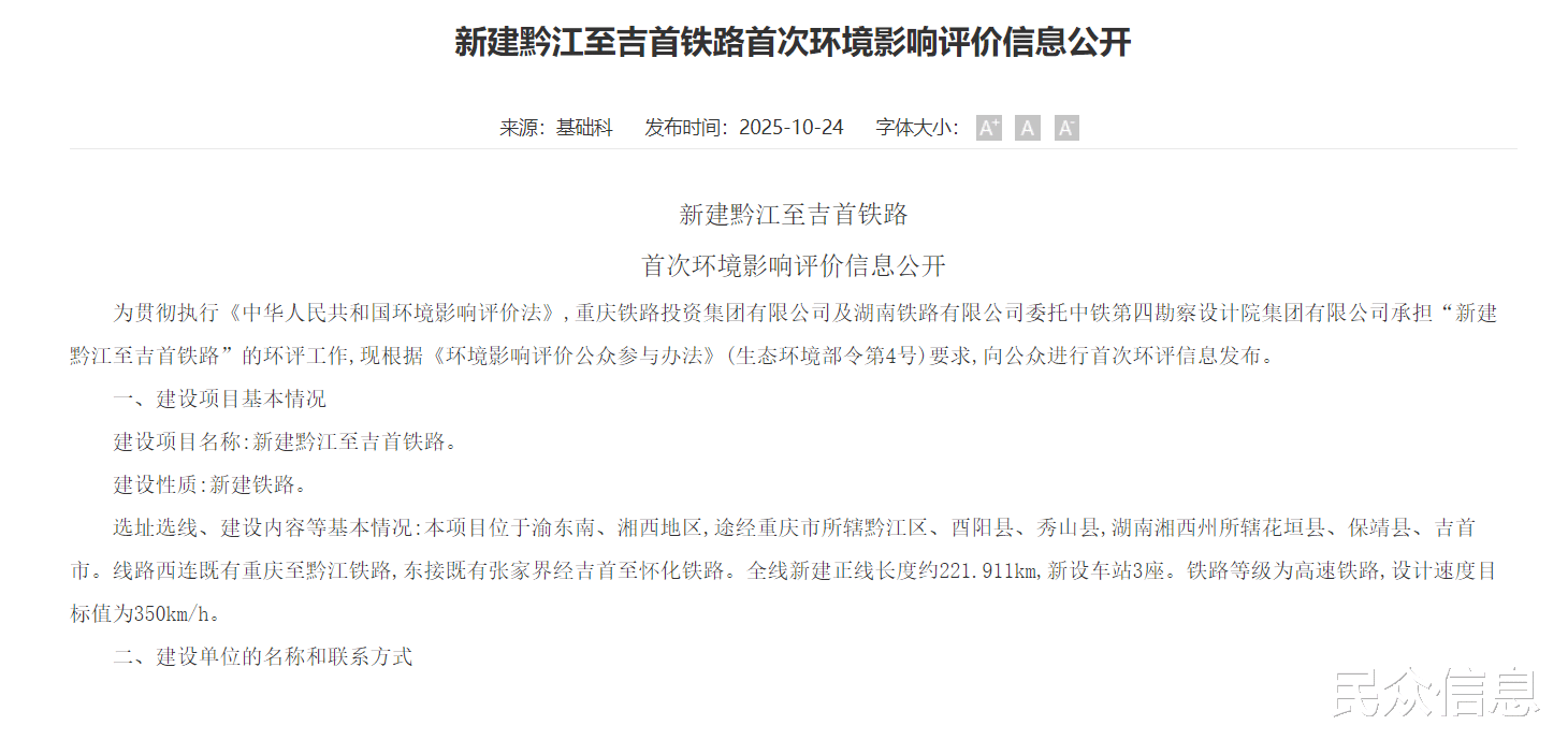 2025年10月24日,新建黔江至吉首铁路首次环境影响评价信息在湘西州发改委网站公开,这标志着该项目即将进入环境影响报告书编制阶段。
