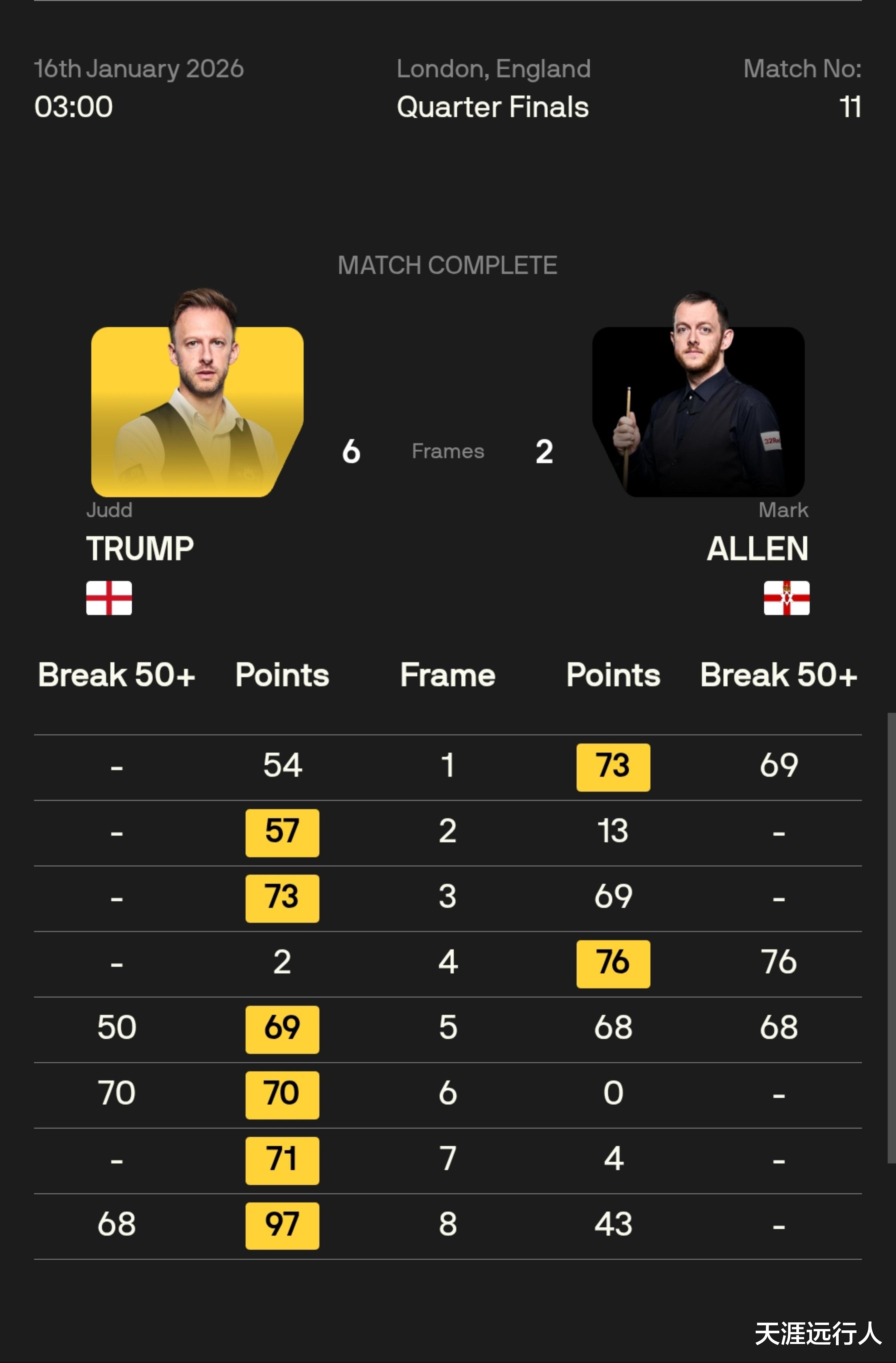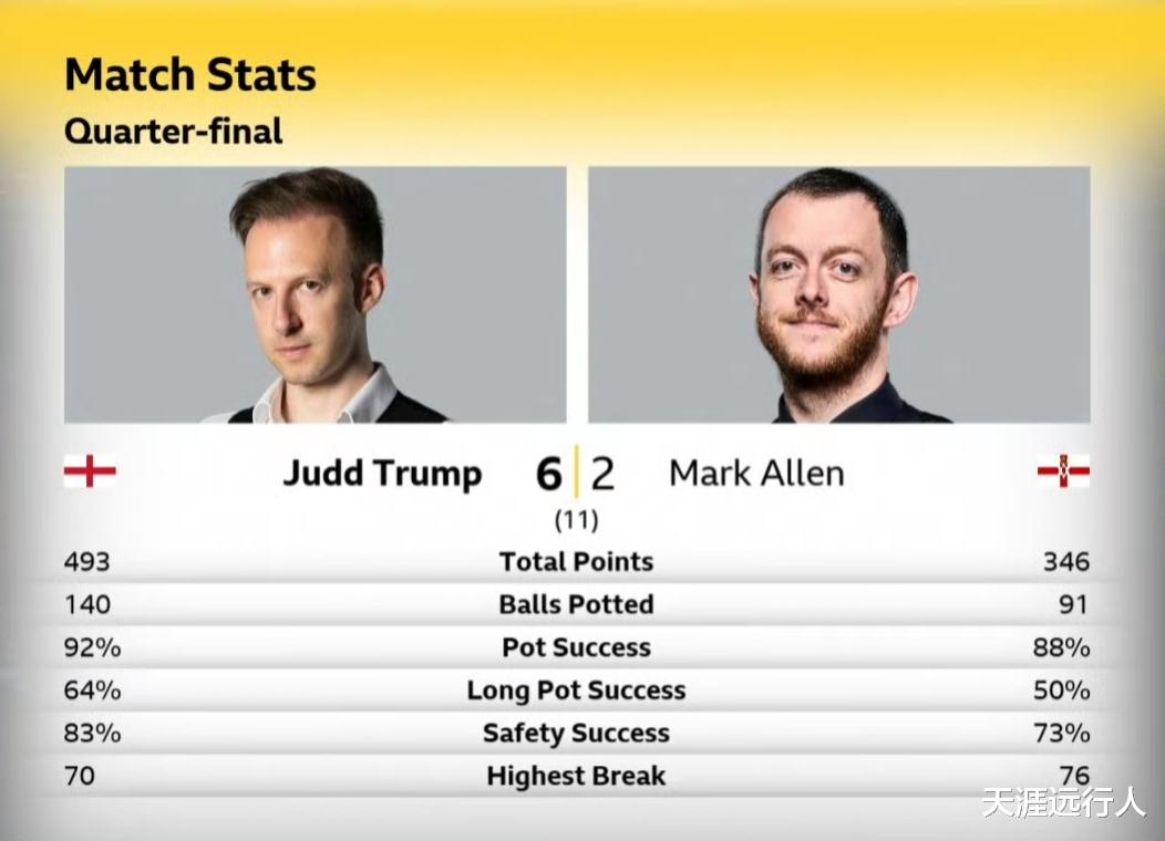 前四局,艾伦先拔头筹,第四局追平,半场双方战成2-2平,局休回来,贾德·特鲁姆普大发神威,一波四连鞭,连胜四局,贾德·特鲁姆普以6-2战胜马克·艾伦,晋级四强,半决赛将对阵约翰·希金斯。