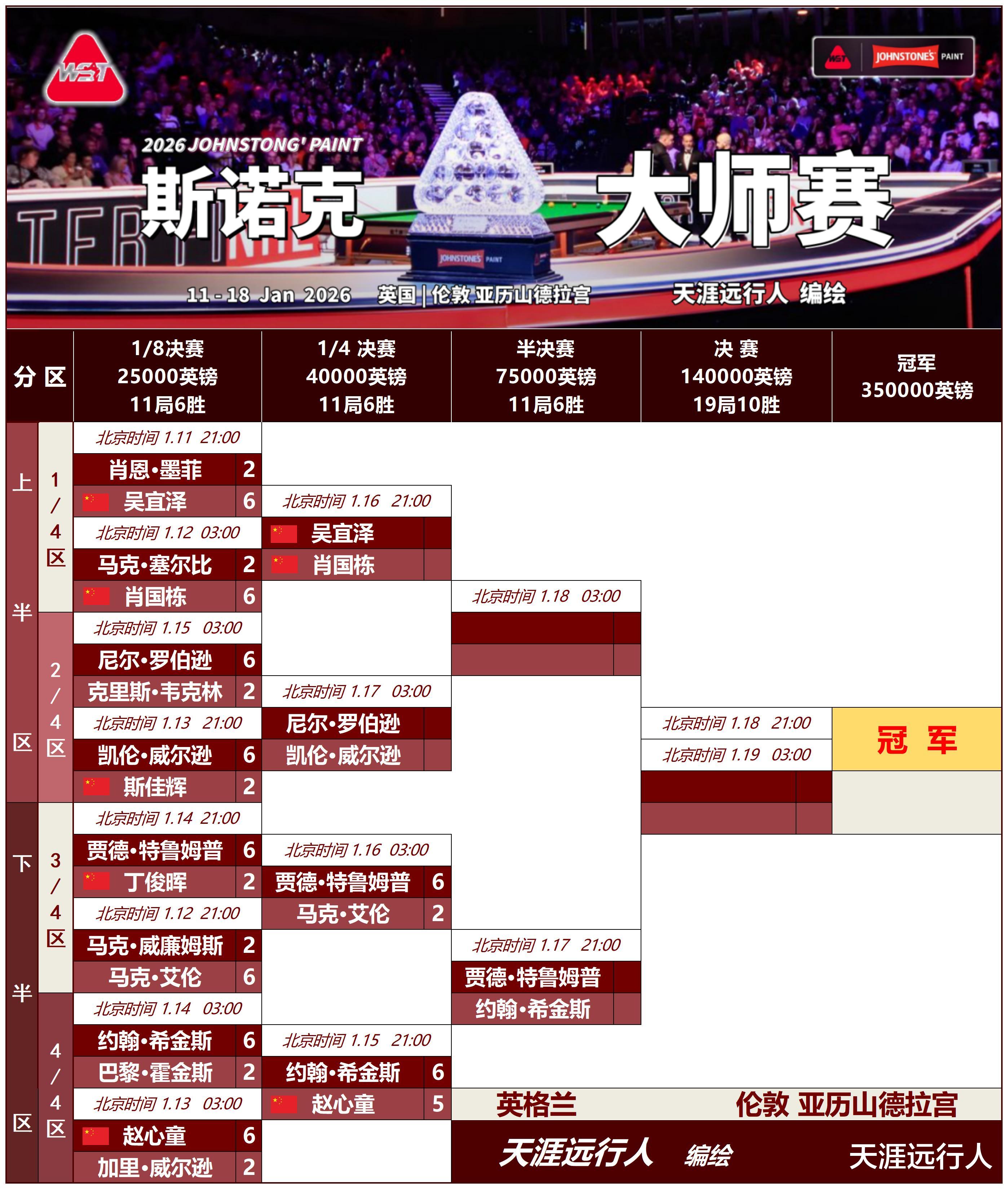 最新斯诺克大师赛完整进程签表,一表看大师赛全程,各位看官老师敬请转发收藏,以备不时之需