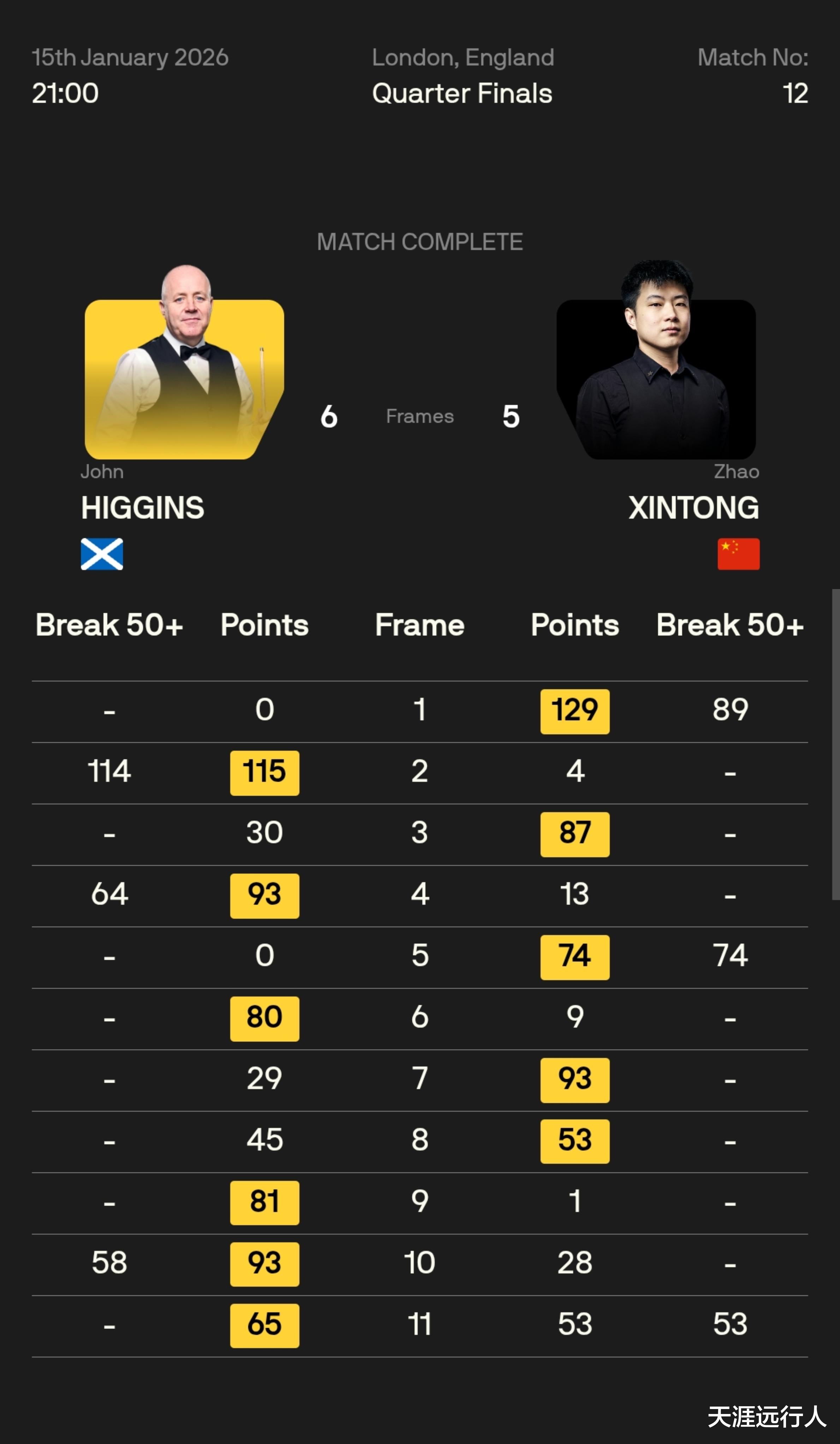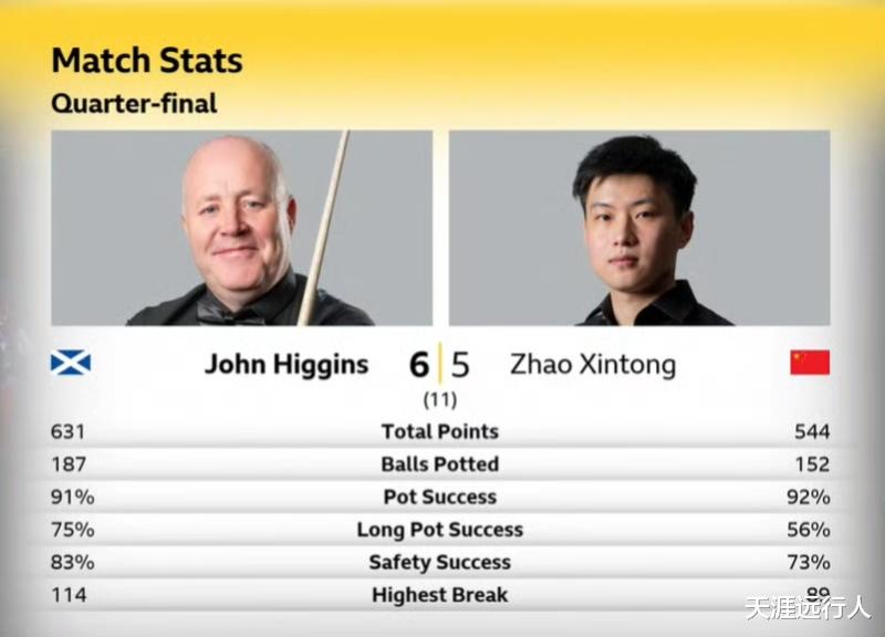 本场比赛,赵心童打出单杆89、74、53分,约翰·希金斯打出单杆114、64、58分。开场前六局两人交替取胜 梅花间竹,打成3-3,接下来赵心童缠斗中连拿两局,以5-3先达赛点。
