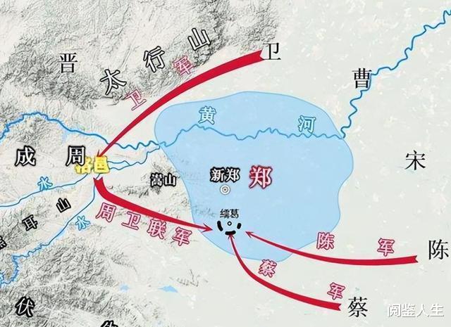 他拼凑了一支“联军”,包括周王室的直属军队,还有陈国、蔡国、卫国的军队,兵分三路,浩浩荡荡杀向郑国。