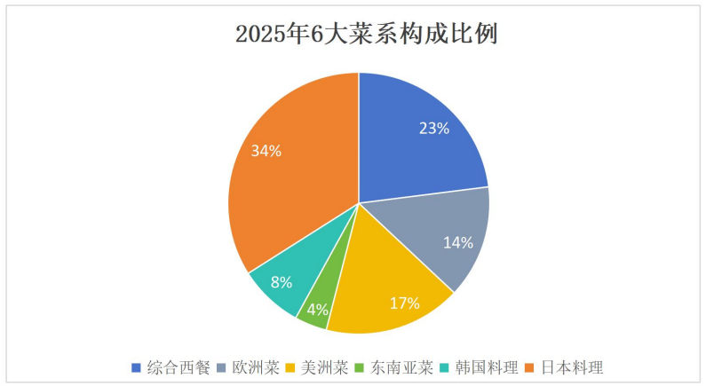 本指数将菜系分为欧洲、美洲、综合西餐和日本、韩国、东南亚6大类。其中6大菜系的构成比例如下: